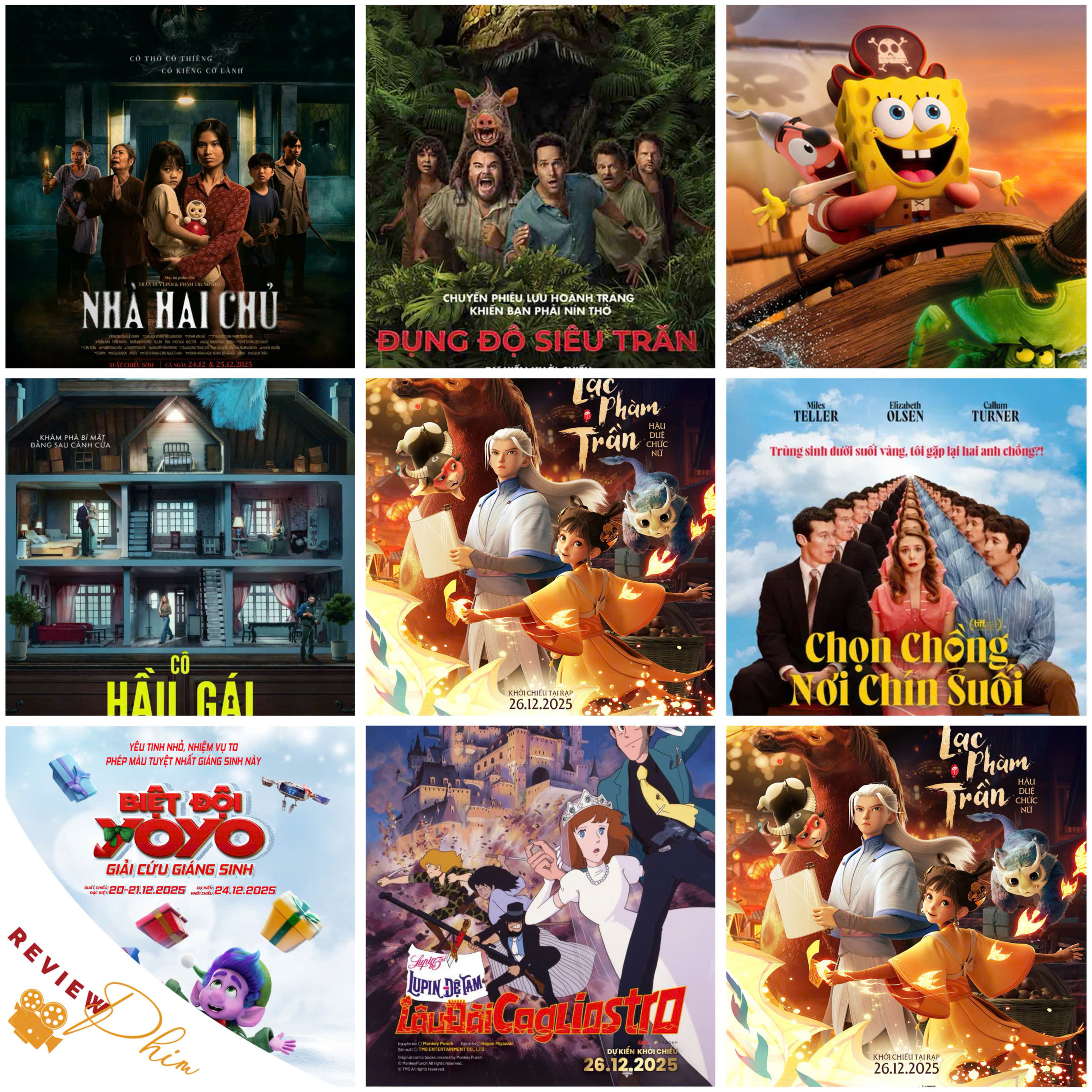 Review các phim ra rạp từ ngày 26/12/2025:NHÀ HAI CHỦ - T13Đạo diễn: Trần Duy Linh & Phạm Trung HiếuDiễn viên: Trâm Anh, Kim Hải, Tạ Lâm, Kim Phương ,Mộc Trà,…Thể loại: Kinh DịMột gia đình nhỏ vì không đủ điều kiện đã phải mua một căn nhà mà người dân xung quanh đồn đoán rằng có nhiều điều kỳ lạ tâm linh liệu gia đình sẽ đối mặt với ngôi nhà nhiều chủ sẽ như thế nào?ĐỤNG ĐỘ SIÊU TRĂN – T13Đạo diễn: Tom GormicanDiễn viên: Jack Black, Paul Rudd, Steve Zahn, Thandiwe Newton, Daniela Melchior, Selton MelloThể loại: Hài, Hành Động, Phiêu LưuDoug (Jack Black) và Griff (Paul Rudd) là đôi bạn thân từ nhỏ, họ đã luôn mơ ước được làm lại bộ phim yêu thích nhất của mình là bộ phim kinh điển Anaconda. Khi khủng hoảng tuổi trung niên thúc đẩy họ đã liều lĩnh thực hiện. Cả bọn lên đường tiến sâu vào rừng Amazon để bắt đầu quay phim. Nhưng mọi chuyện trở nên nguy hiểm khi một con trăn khổng lồ thực sự xuất hiện, biến phim trường hỗn loạn hài hước của họ thành một tình huống chết người. Bộ phim mà họ khao khát làm “gần chết” có lẽ sẽ khiến họ mất mạng thật…CHỌN CHỒNG NƠI CHÍN SUỐI – T13Đạo diễn: David FreyneDiễn viên: Miles Teller; Elizabeth Olsen; Callum TurnerThể loại: Hài, Tình cảmTại "thế giới bên kia", nơi mỗi linh hồn phải lựa chọn "người đồng hành vĩnh cửu", Joan rơi vào drama tình ái khó gỡ bậc nhất lịch sử suối vàng: Chọn người chồng đã gắn bó cả một đời, hay mối tình đầu đã chờ cô vài chục năm tại nơi đây?SPONGEBOB: LỜI NGUYỀN HẢI TẶCĐạo diễn: Derek DrymonDiễn viên: Tom Kenny, Clancy Brown, Rodger Bumpass, Bill Fagerbakke, Carolyn Lawrence, Mr. Lawrence, George Lopez, Isis “Ice Spice” Gaston, Arturo Castro, Sherry Cola with Regina Hall and Mark HamillThể loại: Hài, Hoạt Hình, Phiêu LưuSpongeBob phiêu lưu xuống đáy đại dương để đối mặt với hồn ma của Người Hà Lan bay, vượt qua thử thách và khám phá những bí ẩn dưới biển.CÔ HẦU GÁI – T18Đạo diễn: Paul FeigDiễn viên: Sydney Sweeney, Brandon Sklenar, Amanda Seyfried, ...Thể loại: Bí ẩn, Hồi hộpTừ đạo diễn Paul Feig, một thế giới hỗn loạn sẽ mở ra, nơi sự hoàn hảo chỉ là ảo giác và mọi thứ dường như đều đang che đậy một bí mật đằng sau. Để chạy trốn khỏi quá khứ, Millie (Sydney Sweeney) trở thành bảo mẫu cho gia đình Nina (Amanda Seyfried) và Andrew (Brandon Sklener), một cặp đôi giàu có. Nhưng ngay khi cô chuyển vào sống chung và bắt đầu công việc "trong mơ", sự thật dần được hé lộ.LẠC PHÀM TRẦN: HẬU DUỆ CHỨC NỮĐạo diễn: Ding ZhongDiễn viên: Xin Li, Xiaoyu Liu, Tom Fu,...Thể loại: Hoạt Hình, Khoa Học Viễn Tưởng, Phiêu LưuKim Phong, một thần nhân trẻ tuổi, hạ phàm với sứ mệnh giải cứu mẫu thân bằng cách thu phục 28 tinh linh chòm sao. Trên đường hành hiệp, anh vô tình gặp Ngọc Lộ, cô gái phàm trần quyết tâm vượt lên thần giới để tìm mẹ. Từ những hiểu lầm và ganh đua ban đầu, hai người buộc phải trở thành cộng sự.LUPIN ĐỆ TAM: LÂU ĐÀI CAGLIOSTROĐạo diễn: Miyazaki HayaoDiễn viên: Yasuo Yamada, Eiko Masuyama, Thể loại: Gia đình, Hoạt Hình, Phiêu LưuTrong hành trình đến Công quốc Cagliostro, siêu trộm Lupin III tình cờ cứu một cô dâu xinh đẹp tên Clarisse, người đang bị Bá tước Cagliostro ép cưới để chiếm đoạt quyền lực. Khi tìm cách giải cứu Clarice, Lupin phát hiện bí mật đen tối — một nhà máy sản xuất tiền giả tồn tại suốt 400 năm. BIỆT ĐỘI YOYO: GIẢI CỨU GIÁNG SINHĐạo diễn: Damjan Mitrevski, Ricard CussóThể loại: Gia đình, Hoạt Hình, Phiêu LưuNgay ngày đầu đi làm, Yoyo bàng hoàng nhận ra Bắc Cực không còn ánh sáng phép màu, mà bị thay thế bởi robot vô cảm và những dây chuyền lạnh lẽo. Khi một hacker bí ẩn chiếm quyền điều khiển xưởng quà, toàn bộ Giáng Sinh đứng trước nguy cơ bị xóa sổ, và Yoyo trở thành hy vọng cuối cùng. Cùng biệt đội của mình, cậu lao vào hành trình tìm lại ông già Noel, vượt qua bão tuyết, những cuộc đua kỳ lạ cũng như phải đối mặt với quá khứ đau lòng. ----------------------------------#8saigon #reviewphimrap #nhahaichu #dungdosieutran #chonchongnoichinsuoi #cohaugai