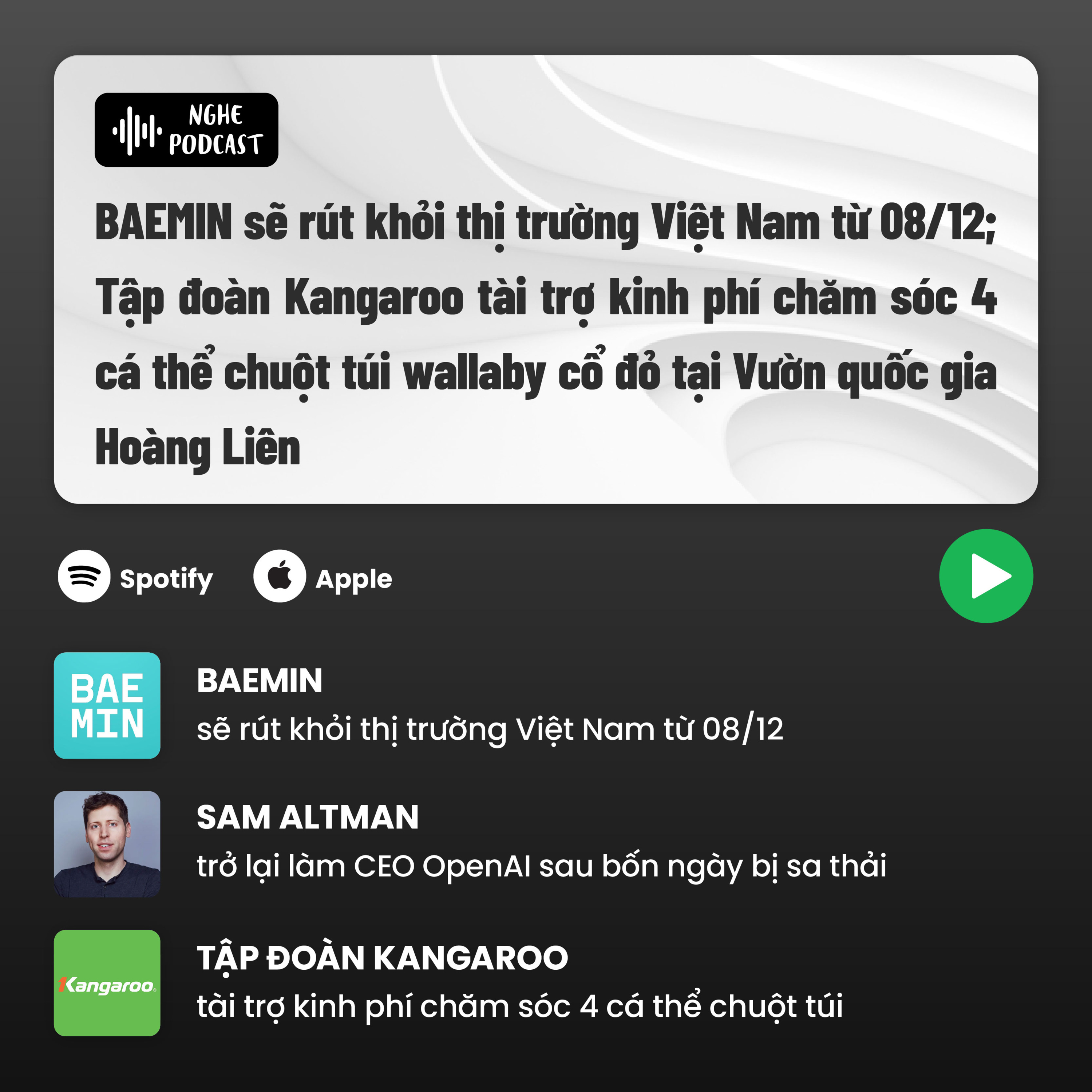 Điểm tin tuần: BAEMIN sẽ rút khỏi thị trường Việt Nam từ 08/12; Tập đoàn Kangaroo tài trợ kinh phí chăm sóc 4 cá thể chuột túi wallaby cổ đỏ tại Vườn quốc gia Hoàng Liên - Điểm tin tuần #48