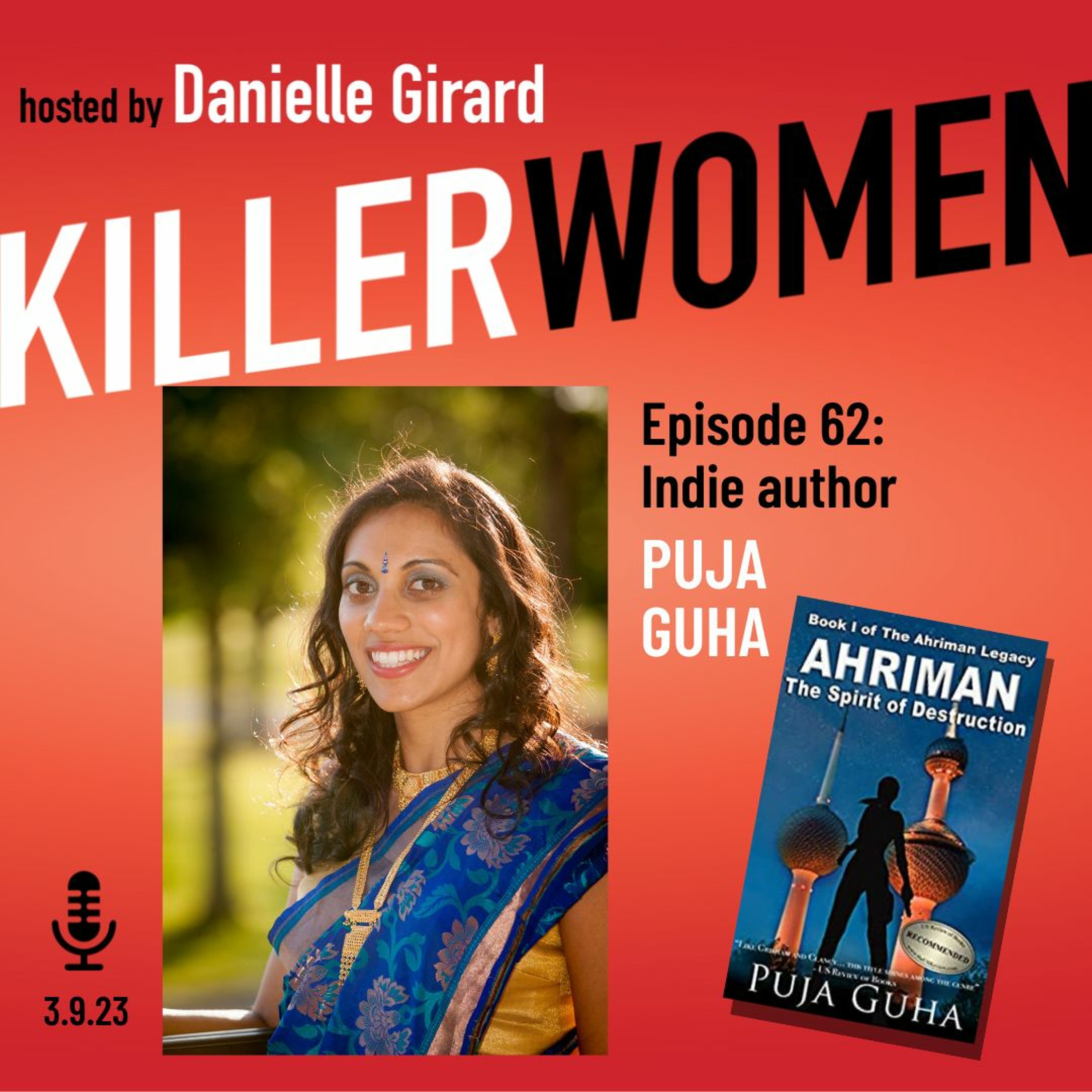 This week on Killer Women Podcast, our guest is Puja Guha. Puja grew up and has worked all over the world, something which she channels into her writing, incorporating settings from New York to Madagascar to Iran. So far, she has published four spy thrillers, an international family drama and a psychological thriller. Her spy thriller series THE AHRIMAN LEGACY is an Amazon bestseller. The series begins with THE SPIRIT OF DESTRUCTION, in which former spy Petra Shirazi comes face to face with the Ahriman, a deadly Iranian assassin named for the Persian spirit of destruction. The rest of the series follows their adventures together, and in the most recent book RECKONING FROM THE SHADOWS they become embroiled in a power struggle with Chinese intelligence that begins in Paris and culminates in the African Great Lakes region. Her recent psychological thriller SIRENS OF MEMORY was named one of the best crime fiction books of 2021 by Diverse Voices Book Review.