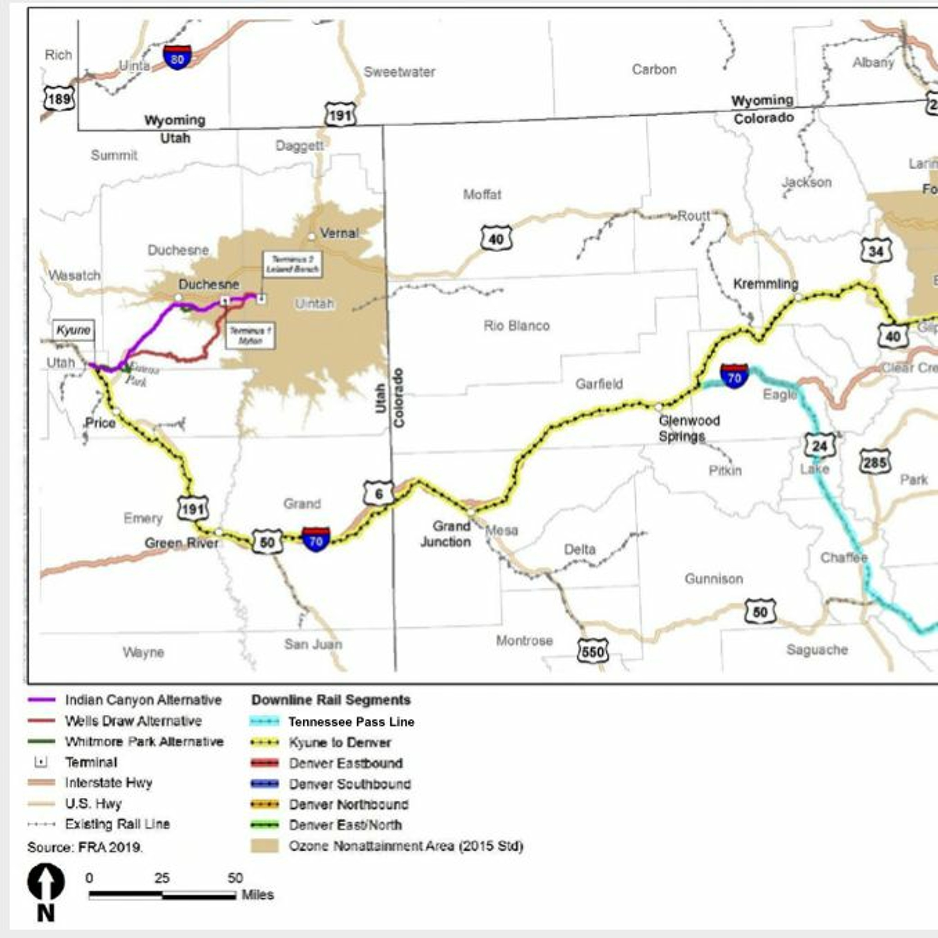 //Photo: A map of the proposed Uinta Basin Railway show where the new tracks would connect to the Union Pacific line, carrying oil through Utah and Colorado on its way to the Gulf of Mexico.