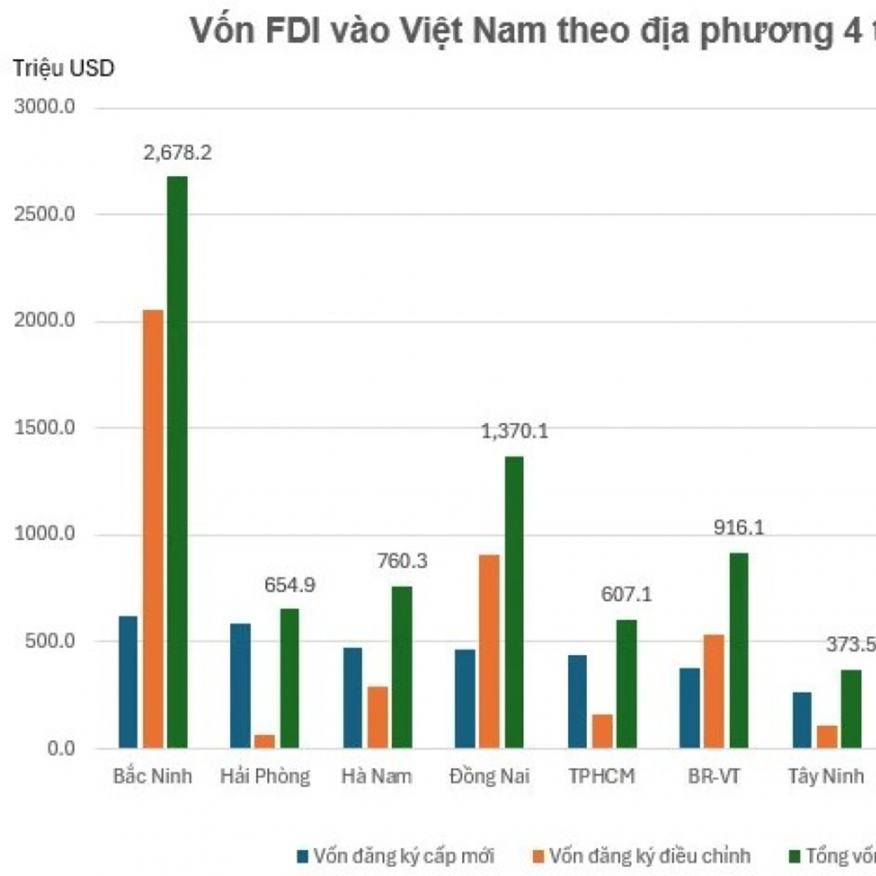 VOV1 - Theo Chi cục Thống kê tỉnh Bắc Ninh, trong 4 tháng đầu năm, địa phương thu hút được hơn 1,91 tỷ USD vốn đầu tư nước ngoài (FDI), tăng 2,2 lần so với cùng kỳ năm trước, dẫn đầu thu hút vốn FDI trong cả nước.