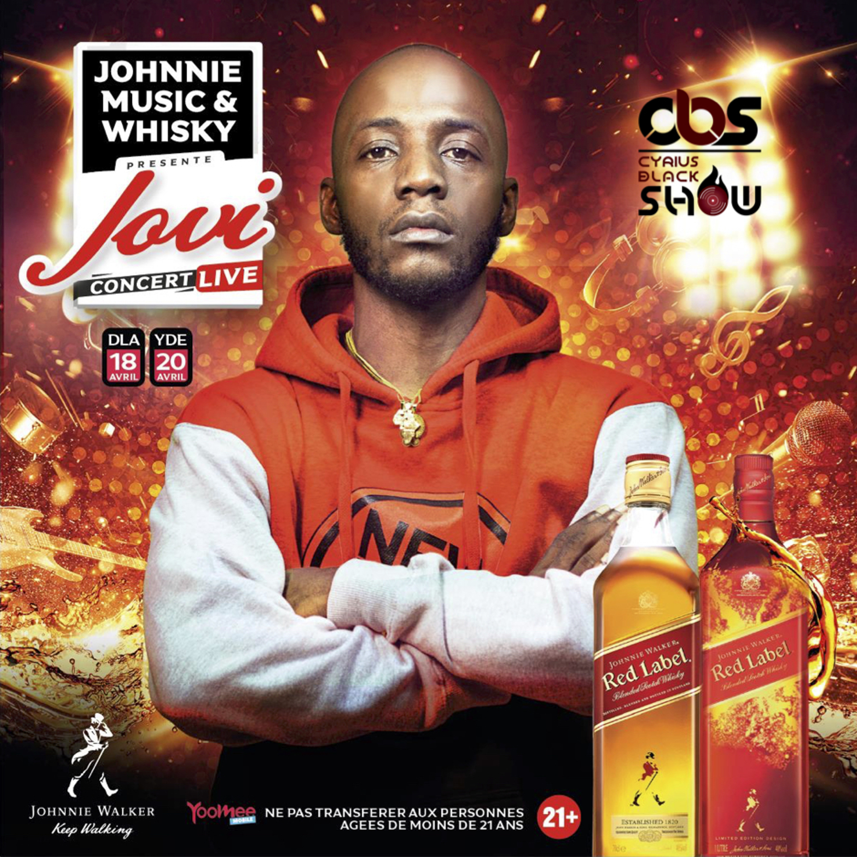 JOHNNIE MUSIC & WHISKY présente JOVI en CONCERT LIVE le 18 Avril à Douala et le 20 Avril 2019 à Yaoundé. Chaque bouteille de Johnnie Walker Red Label achetée dans nos points de vente partenaires vous donne droit à un ticket + une carte SIM avec 3 Giga de data inclus. AccÚs interdit aux personnes de moins de 21 ans. à consommer avec modération #JMW #KeepWalking #CyriusBlackShow