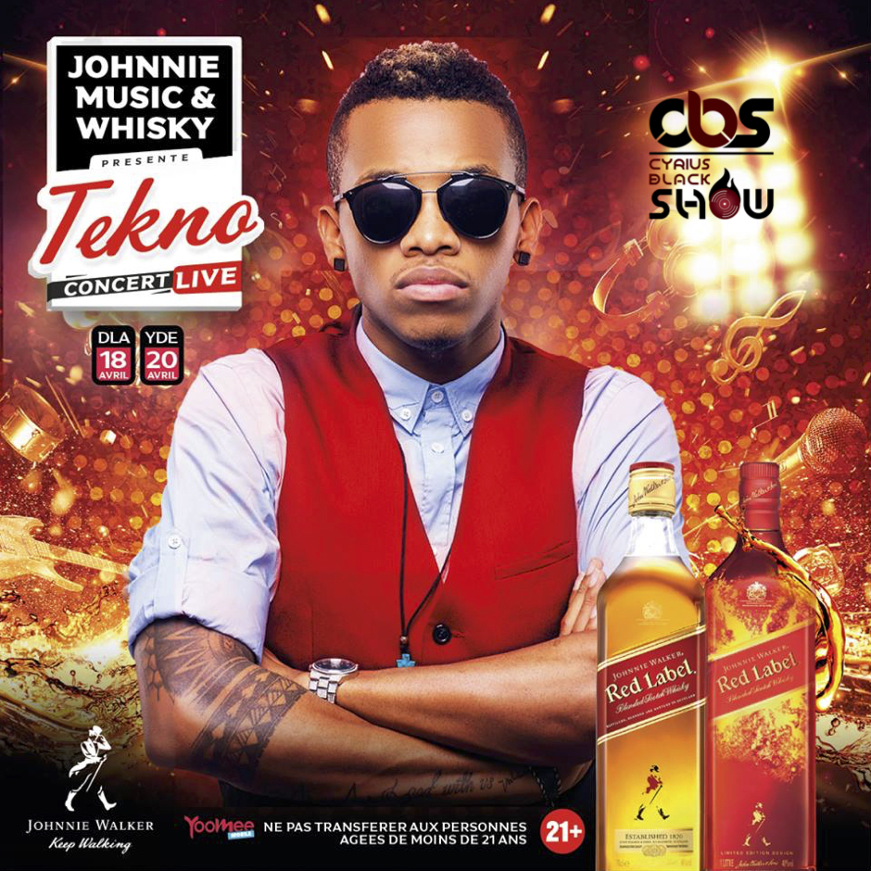 JOHNNIE MUSIC & WHISKY présente TEKNO en CONCERT LIVE le 18 Avril à Douala et le 20 Avril 2019 à Yaoundé. Chaque bouteille de Johnnie Walker Red Label achetée dans nos points de vente partenaires vous donne droit à un ticket + une carte SIM avec 3 Giga de data inclus. AccÚs interdit aux personnes de moins de 21 ans. à consommer avec modération. #JMW #KeepWalking #CyriusBlackShow