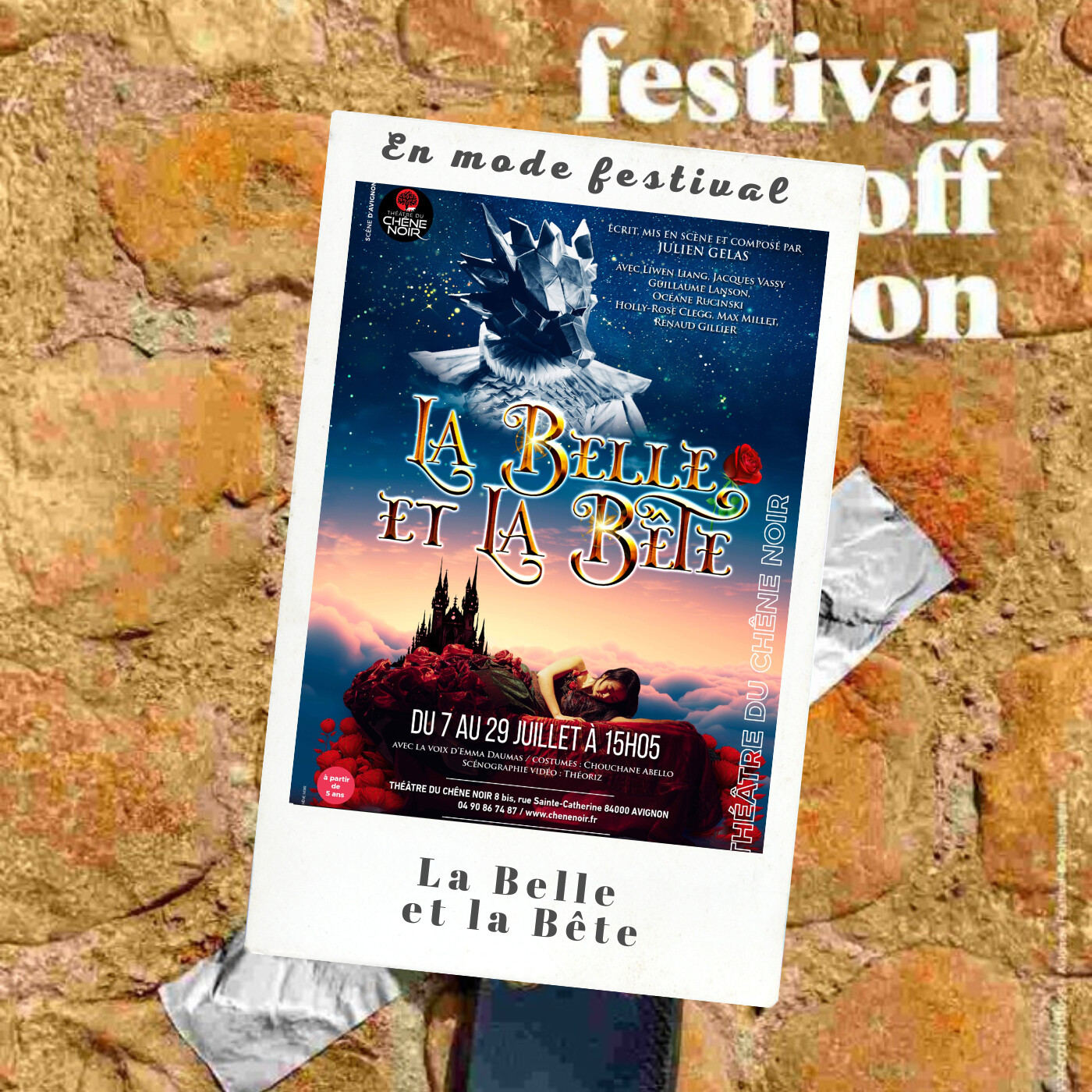 LE FESTIVAL D’AVIGNON, ÇA SE FAIT EN FAMILLE, ET MÊME SI VOUS N’AVEZ PAS D’ENFANT COMME MOI ET BIEN CE N’EST PAS GRAVE, IL Y A DES SPECTACLES JEUNES PUBLICS QUI FONCTIONNENT AUSSI TRÈS BIEN AVEC LES ADULTES ET NOUS PERMETTENT DE GARDER NOTRE TRÈS CHÈRE ÂME D’ENFANT.  Pour se replonger dans notre imaginaire, direction le Chêne Noir pour la toute nouvelle création de Julien Gélas, LA BELLE ET LA BÊTE. Si vous êtes fans du film Disney, la version théâtrale est assez différente. Une version dépoussiérée où la mise en scène utilise une scénographie vidéo interactive avec les acteurices pour nous embarquer dans un univers fantastique où bien évidemment la Belle passe de l’enfance à l’âge adulte en se confrontant à ses peurs. Ce que j’aime quand je vais voir un spectacle jeune public c’est me retourner pendant le spectacle pour regarder les yeux des enfants et voir s’ils se régalent autant que moi, et c’était le cas. Les yeux brillaient de bonheur et pendant tout le spectacle leur écoute était intacte. Et pourtant, chose assez rare dans les spectacles pour enfants, la Belle et la Bête du Chêne Noir dure 1h30. Le public a été captivé du début à la fin et à la sortie de la salle les demandes de dédicaces aux différents personnages ont été nombreuses. Une mention spéciale aux magnifiques costumes réalisés par Chouchane Abello. 📍  J’avais beaucoup aimé l’adaptation du Petit Chaperon Rouge en 2019 par la compagnie du Théâtre, j’ai eu grand plaisir de retrouver la délicatesse et l’élégance de Liwen Gelas en Belle dans cette adaptation réussie, accessible aux enfants à partir de 5 ans, à 15h05 au Chene Noir.  --------------------------------  Auteur : Julien Gelas     Mise en scène : Julien Gelas Interprètes : Liwen Liang, Guillaume Lanson, Jacques Vassy, Renaud Gillier, Océane Rucinski, Holly-Rose Clegg, Max Millet Musique : Julien Gelas Vidéo : Studio Théoriz Costumes : Chouchane Abello Création lumières : Florian Derval  -------------------------------- Pour (ré)écouter les autres reco 'En mode Festival' c'est ici https://podcast.ausha.co/esperluette/playlist/en-mode-festival Retrouvez toutes les interviews d'Esperluette sur : www.esperluette-podcast.fr http://www.esperluette-podcast.fr/  - Instagram https://www.instagram.com/podcast.esperluette/-  Facebook https://www.facebook.com/esperluette.podcast et sur toutes les applis de podcast  Pour ne pas manquer un épisode, pensez  à vous abonner au podcast ou à vous inscrire à la newsletter https://podcast.ausha.co/esperluette?s=1    s