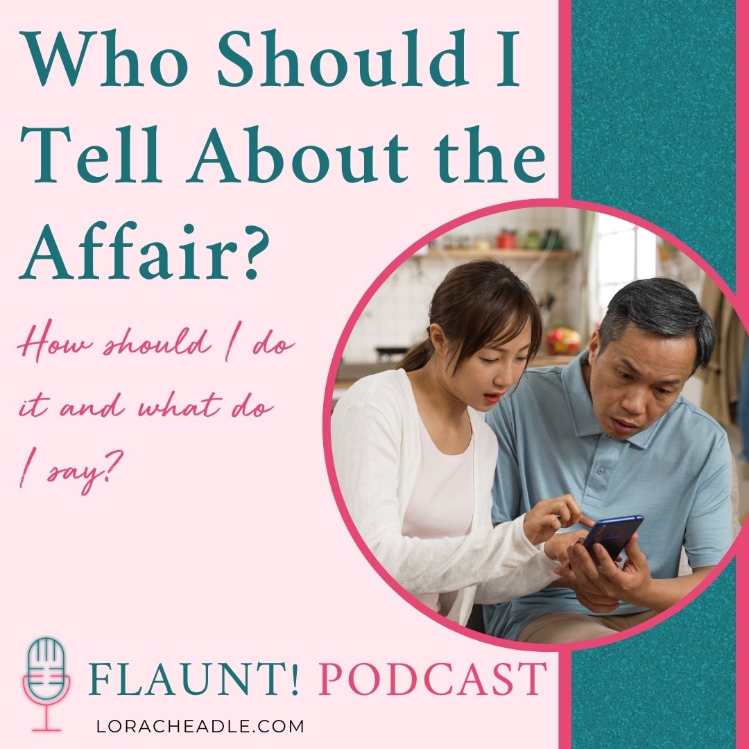 Finding our about your partner’s infidelity is bad enough, but with taboo topics such as this there is often an added layer of concern. What if you tell and people cut you and your partner off? What if people blame you? What if you don’t do what others “expect” and they are mad? This show navigates some of the considerations around who to tell, why, and how. Top take-a-ways __ Preparing to share the truth about infidelity is crucial for success. Sandwich the information between an introductory statement such as, “I have something shocking and sad to share with you…” and stating your desired end of the story. This sets the stage for the conversation and prepares the listener for both the information they are about to receive and what you want from them in the sharing of this information. Seek support and understanding for yourself rather than revenge or public embarrassment for another. Gossipy, negative energy will always come back to bite you, and it’s important to remember that your goal is your own healing. Communicate clearly about the type of support needed and set boundaries for the kind of feedback one desires. Infidelity is hard for anyone to process. Keep yourself safe by asking for exactly what you need. __ Sparkle After Betrayal Recovery Guide at www.BetrayalRecoveryGuide.com http://www.betrayalrecoveryguide.com/, a guide designed to help you take the first steps in feeling better, so you can reclaim your power, own your worth, and start putting yourself, and your life, back together again. Learn More & Apply Here! www.AffairRecoveryForWomen.com http://www.affairrecoveryforwomen.com/ About Lora: Author, speaker and Burnout & Betrayal Recovery Coach, Lora Cheadle help women rebuild their identity and self-worth so they can find the courage to claim what’s possible on the other side of betrayal. https://betterhelp.com/FLAUNTThank you to BetterHelp for sponsoring this podcast! Take charge of your mental health and get 10% off your first month of therapy at https://BetterHelp.com/FLAUNT https://betterhelp.com/FLAUNT Untangle yourself from the past, reclaim your power, and own your worth so you can create a future you love on your own terms. All with a wink and a smile! Learn more at www.loracheadle.com http://www.loracheadle.com/ and follow me across all social! The most comfortable shoes you will ever wear! Available in seven heel heights, these shoes will keep you comfortably on your feet for 12 hours. Made with cork, many styles are available including heels, wedges, and boots. www.EuropeanHeels.com http://www.EuropeanHeels.com $25 off with Discount Code Flaunt https://www.amazon.com/FLAUNT-Cover-Reveal-Smart-Spiritual/dp/1608686213 Purchase Lora’s book, FLAUNT! Drop Your Cover and Reveal Your Smart, Sexy & Spiritual Self https://www.amazon.com/FLAUNT-Cover-Reveal-Smart-Spiritual/dp/1608686213 on Amazon, https://www.amazon.com/FLAUNT-Cover-Reveal-Smart-Spiritual/dp/1608686213IndieBound https://www.indiebound.org/book/9781608686216 or wherever books are sold. Take the Lead in the Dance of Life, Strip out of the Past, and Choreograph Your Future Today!