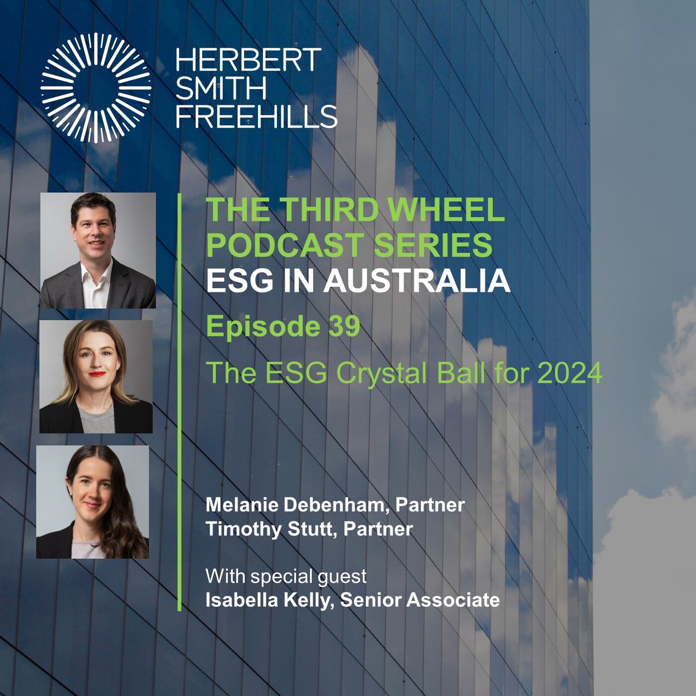 Isabella Kelly https://www.herbertsmithfreehills.com/our-people/i/isabella-kelly fires up the crystal ball and invites Tim Stutt https://www.herbertsmithfreehills.com/our-people/t/timothy-stuttand Mel Debenham https://www.herbertsmithfreehills.com/our-people/m/melanie-debenham to share their ESG predictions for 2024. Mel discusses the timing tightrope for decarbonisation projects, Commonwealth environmental legislative reform and a very different approach to regulation. Tim queries if there is an elastic start date for mandatory climate reporting, whilst the required corporate uplift crystallises. Shifting landscapes emerge for Australia’s Sustainable Finance Strategy, post-Voice referendum pathways, the EU’s Corporate Sustainability Due Diligence Directive and Australia’s Modern Slavery Act reform. They emphasise the important interrelationship between ESG spheres and close with some federal election musings around balancing energy policy and cost of living, social and biodiversity impacts. For more, check out the AICD’s Climate Governance Study 2024 https://www.aicd.com.au/risk-management/framework/climate/climate-governance-study-2024-moving-from-vision-to-action.html, for which Herbert Smith Freehills conducted research into ASX 200 governance structures, and the jointly prepared guide Bringing together ESG: Board structures and sustainability https://www.aicd.com.au/risk-management/framework/climate/bringing-together-esg-board-structures-and-sustainability.html.