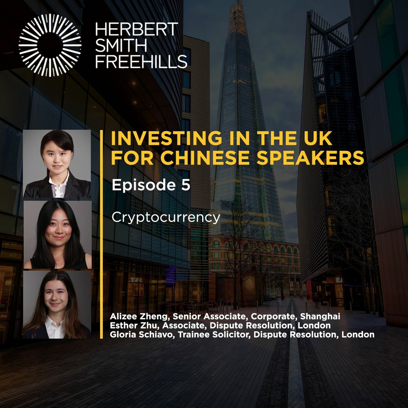 In this episode, we discuss the key legal and practical considerations for investors when dealing with cryptoassets in a UK context. We also explore the changing landscape of regulation of cryptoassets in the UK and the EU. 在本集播客节目中,我们讨论了在英国背景下处理加密资产时,投资者需要考虑的关键法律和实践问题。我们还探讨了英国和欧盟对加密资产监管的变化景观。 Speakers: Alizee Zheng (Senior Associate, Corporate, Shanghai), Esther Zhu (Associate, Dispute Resolution, London), Gloria Schiavo (Trainee Solicitor, Dispute Resolution, London) 主讲人:郑晓夏(上海代表处公司事务部高级律师),Esther Zhu 朱悦尔 (伦敦办公室争议解决部律师), Gloria Schiavo (伦敦办公室争议解决部实习律师)