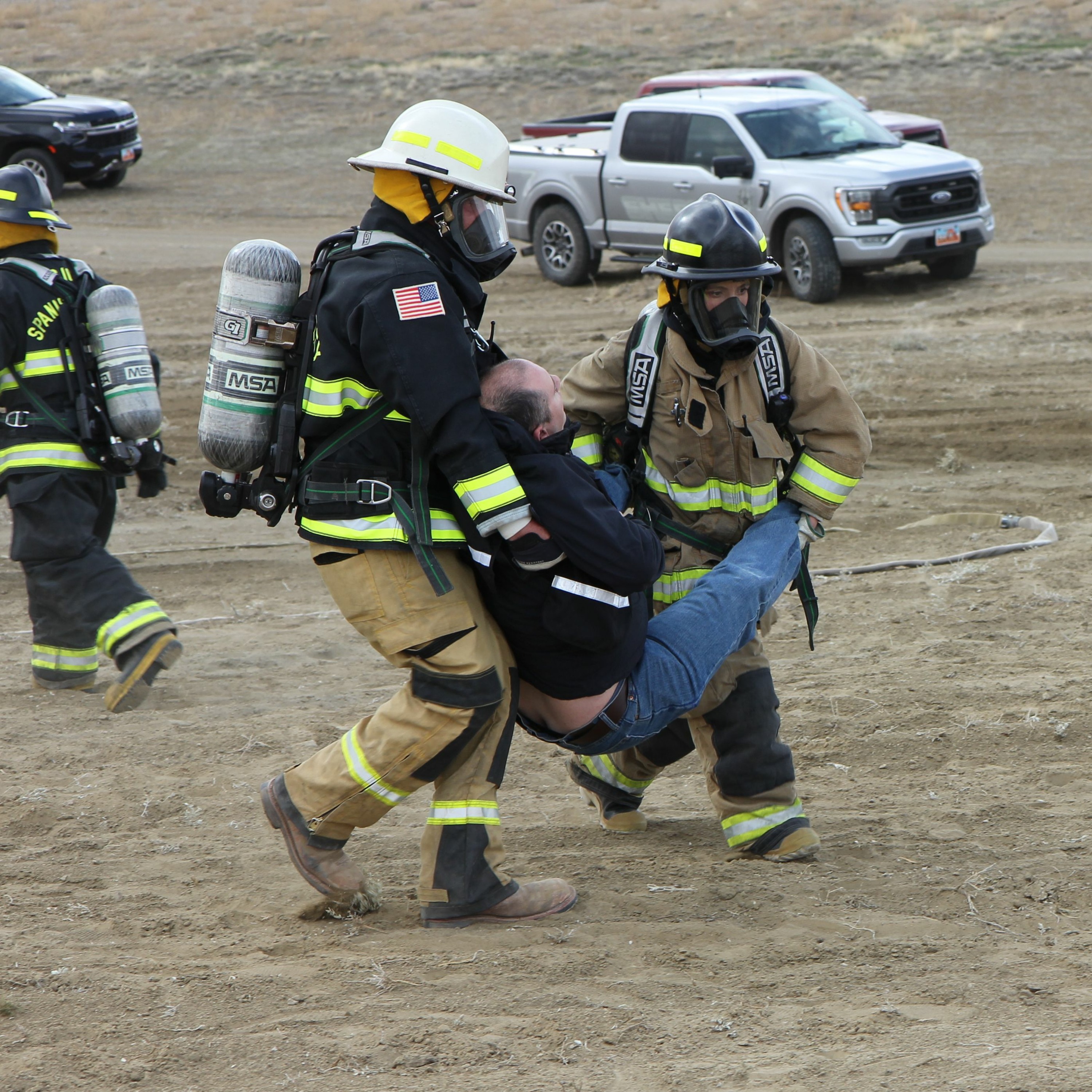 Last week, the Canyonlands Regional Airport staged a fake plane crash as part of a mandatory emergency response exercise. All agencies included in the airport's emergency response plan were present, plus actors from the Grand County High School drama club, who played crash victims. Photo: Emergency responders carry an actor in a plane crash exercise to an ambulance. Photo by Emily Arntsen.