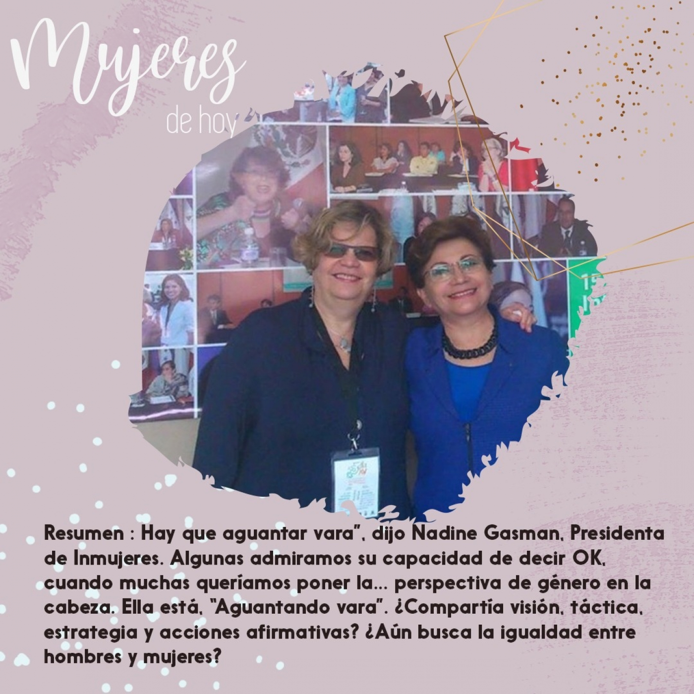 Hay que aguantar vara”, dijo Nadine Gasman, Presidenta de Inmujeres. Algunas admiramos su capacidad de decir OK, cuando muchas queríamos poner la… perspectiva de género en la cabeza. Ella está, “Aguantando vara”. ¿Compartía visión, táctica, estrategia y acciones afirmativas? ¿Aún busca la igualdad entre hombres y mujeres?