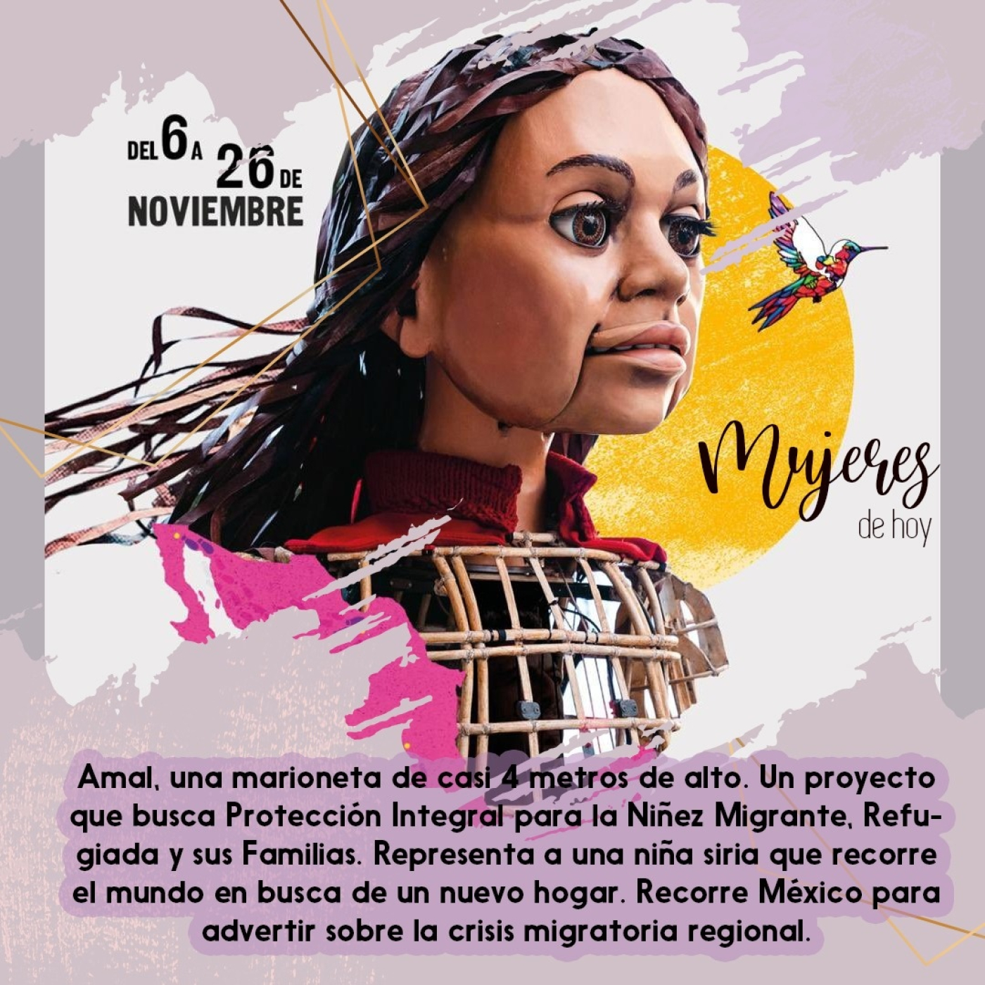 Amal, una marioneta de casi 4 metros de alto. Un proyecto que busca Protección Integral para la Niñez Migrante, Refugiada y sus Familias. Representa a una niña siria que recorre el mundo en busca de un nuevo hogar. Recorre México para advertir sobre la crisis migratoria regional.