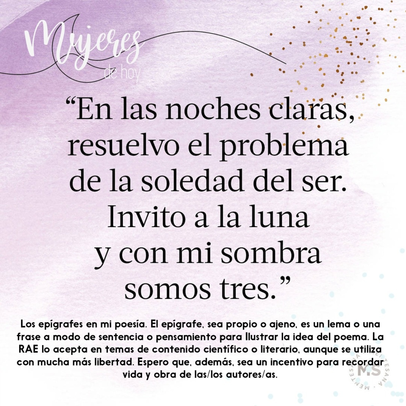 El epígrafe, sea propio o ajeno, es un lema o una frase a modo de sentencia o pensamiento para Ilustrar la idea del poema. La RAE lo acepta en temas de contenido científico o literario, aunque se utiliza con mucha más libertad. Espero que, además, sea un incentivo para recordar vida y obra de las/los autores/as.
