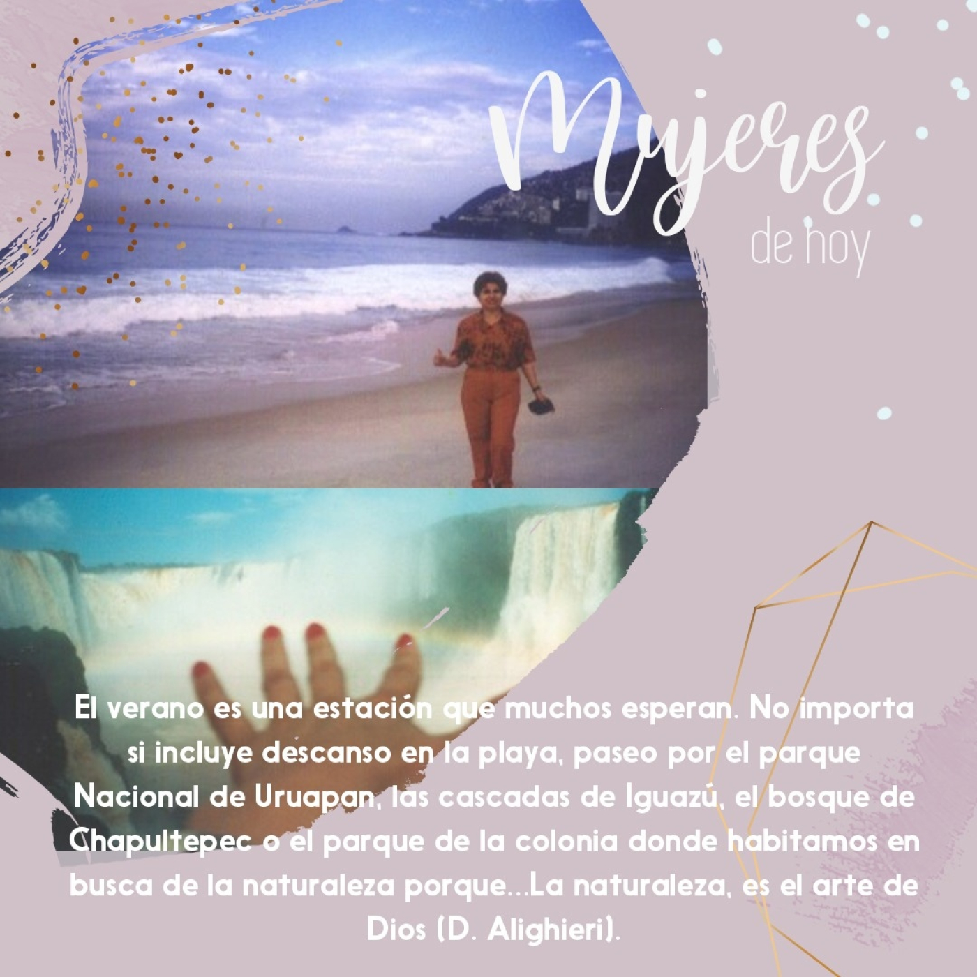El verano es una estación que muchos esperan. No importa si incluye descanso en la playa, paseo por el parque Nacional de Uruapan, las cascadas de Iguazú, el bosque de Chapultepec o el parque de la colonia donde habitamos en busca de la naturaleza porque…La naturaleza, es el arte de Dios (D. Alighieri).
