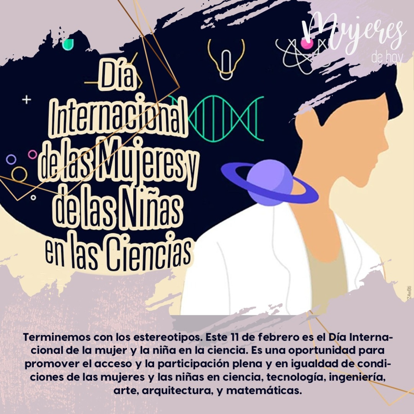 Terminemos con los estereotipos. Este 11 de febrero es el Día Internacional de la mujer y la niña en la ciencia. Es una oportunidad para promover el acceso y la participación plena y en igualdad de condiciones de las mujeres y las niñas en ciencia, tecnología, ingeniería, arte, arquitectura, y matemáticas.