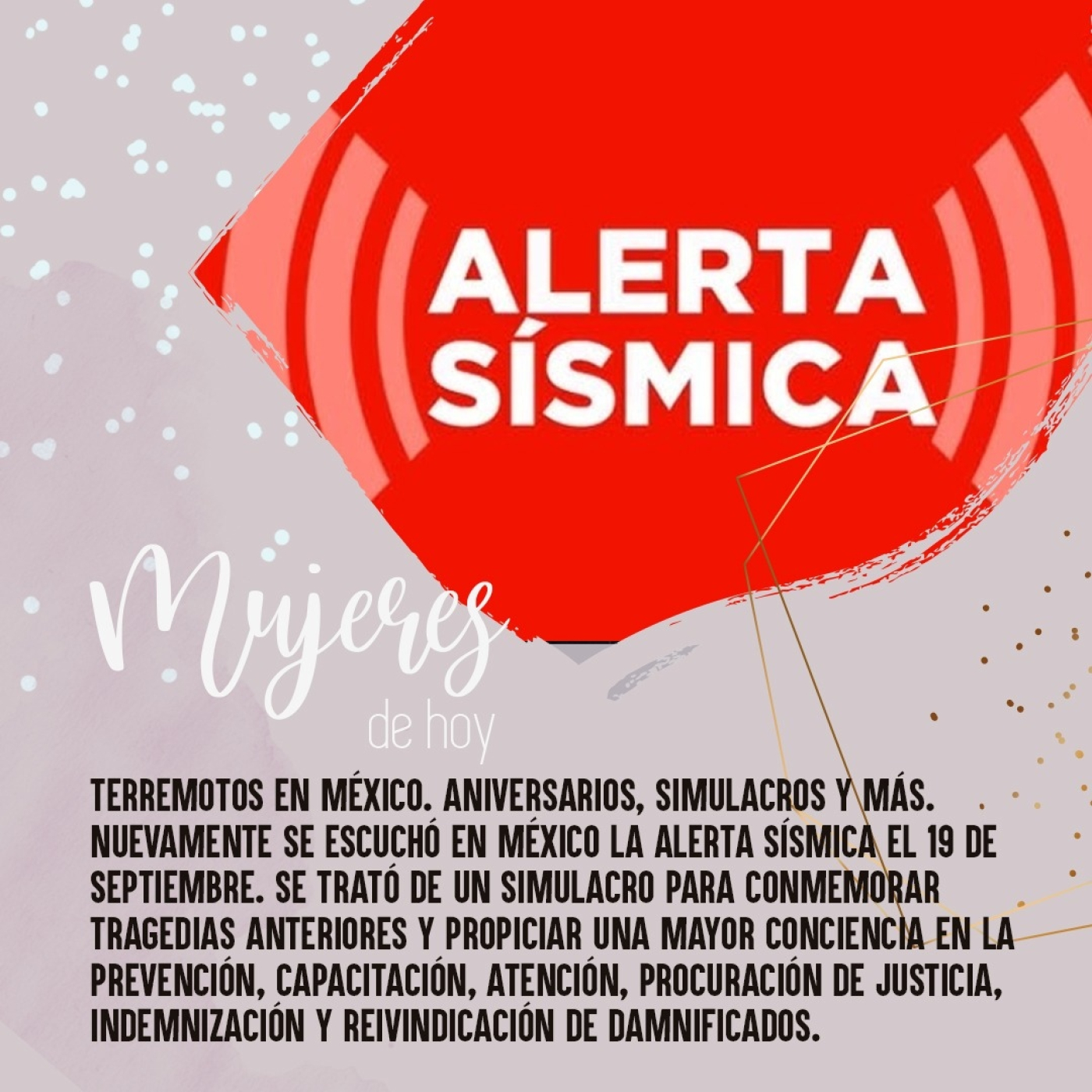 Terremotos en México. Aniversarios, simulacros y más. Nuevamente se escuchó en México la alerta sísmica el 19 de septiembre. Se trató de un simulacro para conmemorar tragedias anteriores y propiciar una mayor conciencia en la prevención, capacitación, atención, procuración de justicia, indemnización y reivindicación de damnificados.