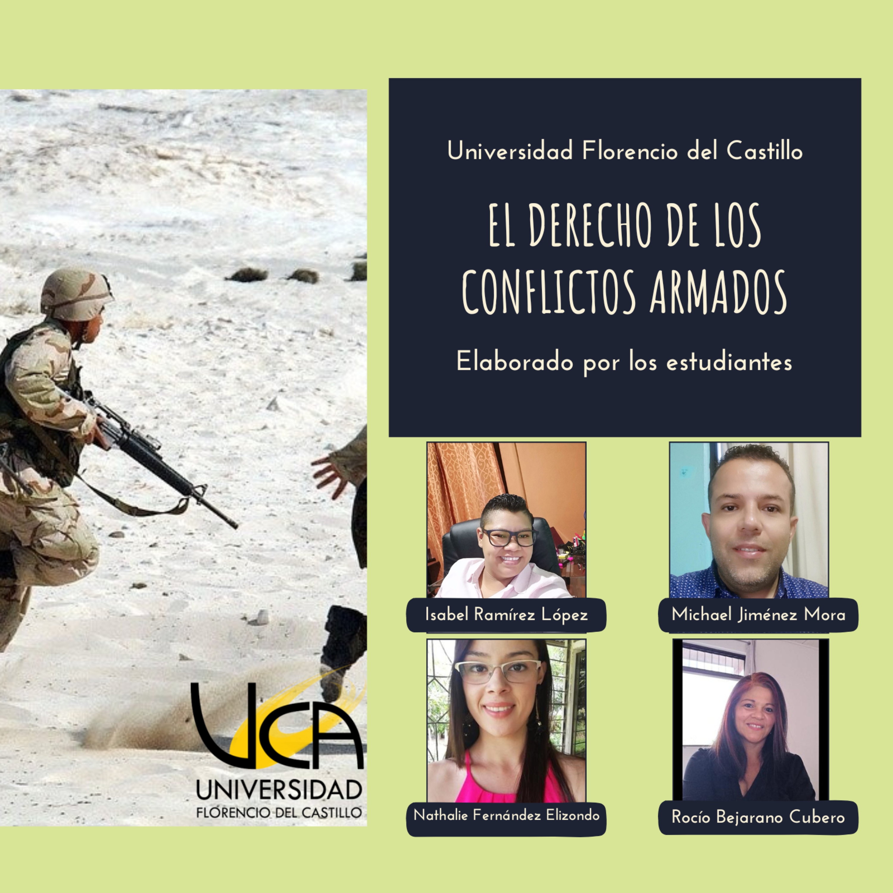 Los estudiantes de la carrera de derecho Isabel Ramírez López, Michaell Jiménez Mora, Nathalie Fernández Elizondo y Rocío Bejarano Cubero hablaran sobre el derecho de los conflictos armados en el curso de la Licenciada Karen Leandro Box, profesora de la Universidad Florencio del Castillo.