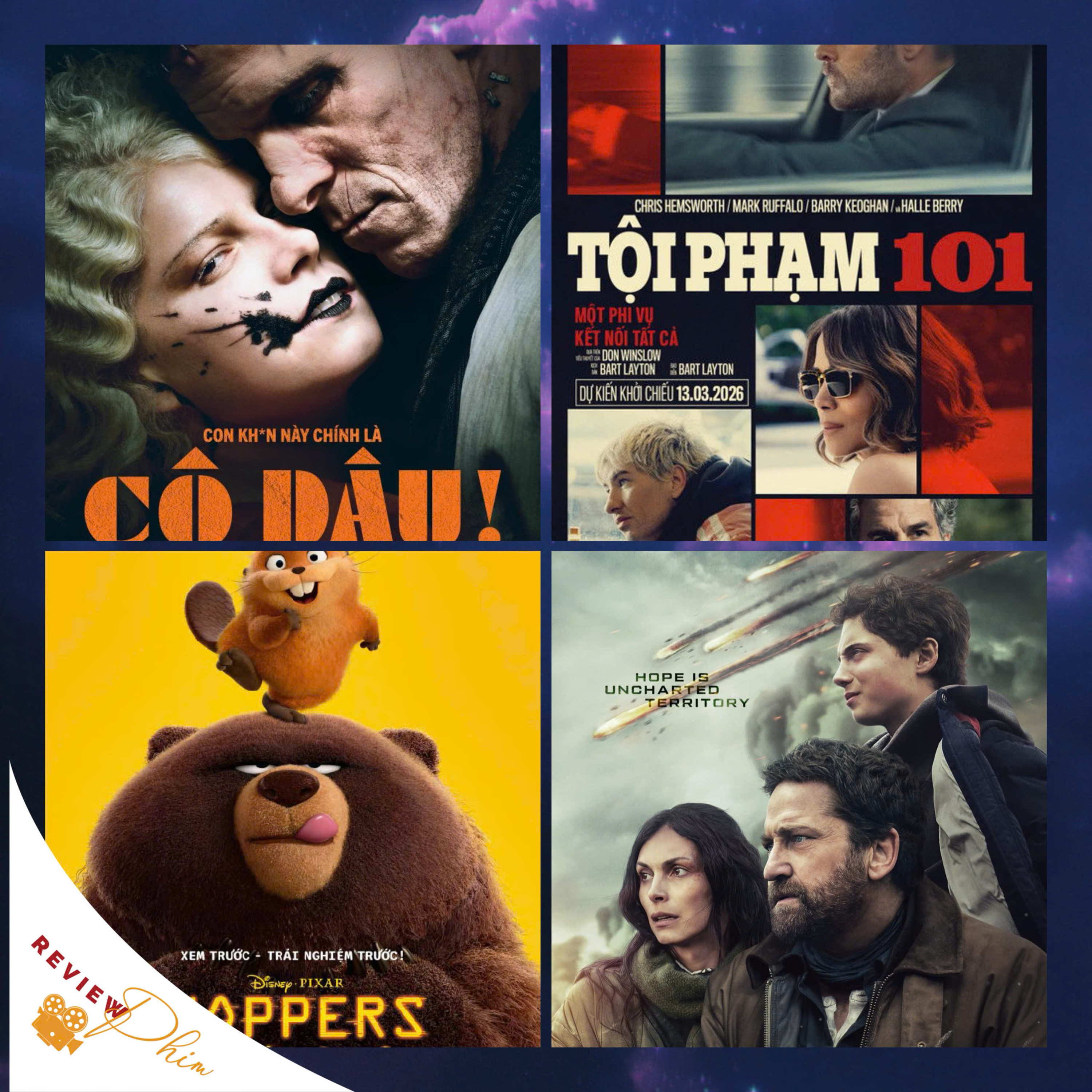 Review các phim ra rạp từ ngày 13/03/2026TỘI PHẠM 101 – T18Đạo diễn: Bart LaytonDiễn viên: Chris Hemsworth, Mark Ruffalo, Halle Berry, Barry Keoghan, Monica Barbaro, Corey Hawkins, Jennifer Jason Leigh, Nick NolteThể loại: Hồi hộp, Tội phạmLấy bối cảnh thành phố Los Angeles đầy nắng và bụi đường, Tội Phạm 101 kể về một tên trộm nữ trang bí ẩn (Chris Hemsworth) với hàng loạt phi vụ táo bạo khiến cảnh sát phải đau đầu. Trong lúc chuẩn bị cho phi vụ lớn nhất của mình, hắn gặp gỡ một nữ nhân viên bảo hiểm (Halle Berry), người cũng đang vật lộn với những lựa chọn trong đời mình. Trong khi đó, một thanh tra (Mark Ruffalo) đã tìm ra quy luật trong chuỗi các vụ án và đang ráo riết truy đuổi tên trộm, khiến cuộc chơi trở nên căng thẳng hơn bao giờ hết. Khi phi vụ định mệnh đến gần, ranh giới giữa kẻ săn đuổi và con mồi dần trở nên mờ nhạt và cả ba buộc phải đối mặt với những lựa chọn khó khăn và không còn cơ hội để quay đầu lại. Bộ phim được chuyển thể từ tiểu thuyết ngắn nổi tiếng cùng tên của Don Winslow, do Bart Layton (tác giả của American Animals, The Imposter) viết kịch bản và đạo diễn. Dàn diễn viên có sự tham gia của Barry Keoghan, Monica Barbaro, Corey Hawkins, Jennifer Jason Leigh và Nick Nolte.CÔ DÂU! – T18Đạo diễn: Maggie GyllenhaalDiễn viên: Jake Gyllenhaal, Christian Bale, Jessie Buckley,…Thể loại: Kinh Dị, Nhạc kịch, Tình cảmMột cách tiếp cận táo bạo, phá vỡ mọi khuôn mẫu đối với một trong những câu chuyện hấp dẫn nhất thế giới. Bộ phim theo chân Frankenstein cô đơn (do Chrisitian Bale thủ vai) lên đường đến Chicago những năm 1930 để tìm đến nhà khoa học Dr. Euphronious (Annette Bening – 5 lần đề cử Oscar thủ vai), với hy vọng bà có thể tạo ra một người bạn đồng hành cho mình. Cả hai hồi sinh một cô gái trẻ đã bị sát hại, và Cô Dâu (Buckley thủ vai) đã ra đời. Những gì xảy ra sau đó đã vượt xa mọi tưởng tượng của họ: những vụ giết người, sự chiếm hữu, một phong trào văn hóa hoang dại và cấp tiến cũng như mối tình ngoài vòng pháp luật đầy cuồng nhiệt và bùng nổ!GREENLAND 2: ĐẠI DI CƯ – T13Đạo diễn: Ric Roman WaughDiễn viên: Gerard Butler; Morena Baccarin; Roman Griffin DavisThể loại: Hành Động, Hồi hộpBom tấn thảm họa thiên thạch trở lại! 5 năm sau cú va chạm tuyệt diệt, nhân loại một lần nữa đứng trước bờ vực bị xóa sổ. Buộc phải rời khỏi hầm trú ẩn, gia đình Garrity bắt đầu cuộc đại di cư khẩn thiết đầy khắc nghiệt. Một hành trình không đường lui, nơi mỗi bước chân đều là cuộc chiến giành lấy cơ hội tồn tại trong một thế giới đã lụi tàn.CÚ NHẢY KỲ DIỆUĐạo diễn: Daniel ChongDiễn viên: Jon Hamm, Bobby Moynihan, Piper CurdaThể loại: Gia đình, Hài, Hoạt Hình, Phiêu LưuHoppers xoay quanh Mabel, một cô gái yêu động vật, vô tình tiếp cận công nghệ cho phép chuyển ý thức con người vào cơ thể robot động vật. Nhờ đó, Mabel “nhảy” vào thế giới tự nhiên dưới hình dạng một con hải ly và có thể giao tiếp trực tiếp với các loài khác. Trong hành trình này, cô dần khám phá cách động vật nhìn nhận con người, đồng thời phát hiện những mối nguy đang đe dọa môi trường sống của chúng. Tận dụng công nghệ Nhảy, Mabel đã trở thành cầu nối, mang lại cuộc sống cân bằng cho cả con người và động vật.-----------------------------------------#8saigon #reviewphimrap #cunhaykydieu #toipham101 #hoppers #codau2026 #greenland2