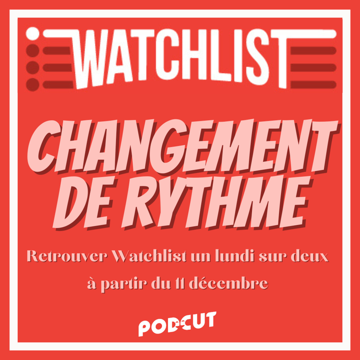 📢 Pas de reco cette semaine, mais une petite annonce : Watchlist passe en quinzaine. Prochaine reco, le 11 décembre. En attendant, dès que vous avez fini de regarder toute l'offre de films de Noël, vous pouvez, vous aussi, participer à Watchlist.  Pour cela, pas besoin de faire déjà du podcast pour ça, ni d'avoir du matériel de pro, ni même de savoir faire du montage, parce que ça on s'en occupe. En gros, un smartphone et une pièce un peu calme, et une truc à regarder qui vous a plu suffisent ! Tout est expliqué là 👉 https://docs.google.com/document/d/1sq0_ZVp58yA8e2BLMhcNcs8MwYZq24oKeL3BmB_PKAk/edit?usp=sharing  N'hésitez pas à nous contacter sur Insta ou sur Discord (oubliez Twitter, on n'y va plus) __ __ A la semaine prochaine pour une nouvelle reco 🤗 Bon décembre à tout le monde __ __ https://www.patreon.com/podcut http://podcut.studio/ https://kevinboyer.myportfolio.com/